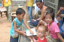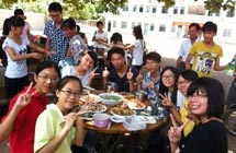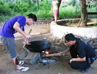 在三教村,志愿者受到了當(dāng)年解放軍進(jìn)城的待遇。由于小學(xué)在施工不便住宿,村民便打開(kāi)自家新裝修的房子請(qǐng)隊(duì)員們住。接著隊(duì)員們到露天廚房大展身手,灶臺(tái)是由幾個(gè)石頭和一個(gè)大鐵鍋搭建而成。指導(dǎo)老師看大家興致高,也過(guò)來(lái)起火,燒柴。有天傍晚,烏云密布,眼瞅著雨就要掉下來(lái),為了能讓志愿者們下雨前吃到飯,熱心的村民為志愿者們買醬料,給他們燒起了飯。