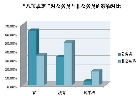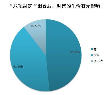 截至2013年12月20日10時,共收到網(wǎng)絡問卷2442份,48.4%的受訪者認為“八項規(guī)定”對個人生活有影響,其中公務員群體認為“八項規(guī)定”帶來的最大影響是“公務吃請少了,能抽出更多時間陪伴家人”和“津貼補貼獎金少了,勒緊褲帶過日子”,非公務員群體認為“八項規(guī)定”帶來的最大影響是“酒店、高端會所門外的公務用車少了”和“遇到領導考察工作時,地毯鮮花迎送領導的情況少了”。