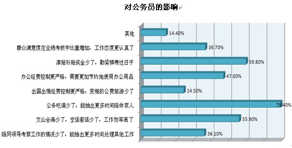 還有三到五成受訪公務員認為“辦公經(jīng)費控制更嚴格,需要更加節(jié)約地使用辦公用品”、“群眾滿意度在業(yè)績考核中比重增加,工作態(tài)度更認真了”和“陪同領導考察工作的情況少了,能抽出更多時間處理其他工作”是“八項規(guī)定”帶來的幾大影響。