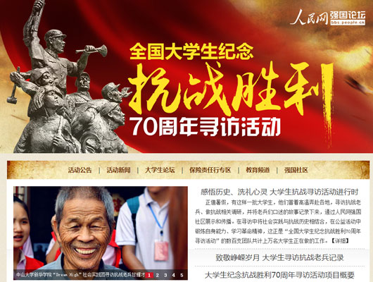 本次活動吸引了來自全國200多所高校的800支大學生團隊報名,大學生們尋訪抗戰老兵,聆聽抗戰故事,重走抗戰遺址,調研人文歷史,感悟革命精神。各團隊實踐期間在人民網強國社區大學生論壇實時播報實踐進程,發回稿件數千篇。浙江大學一位學生在實踐總結中說:“我們的活動通過人民網的平臺得到了更多媒體的關注,讓更多的人關注到關愛抗戰老兵行動,這個暑假沒有白過,真的很有意義!”