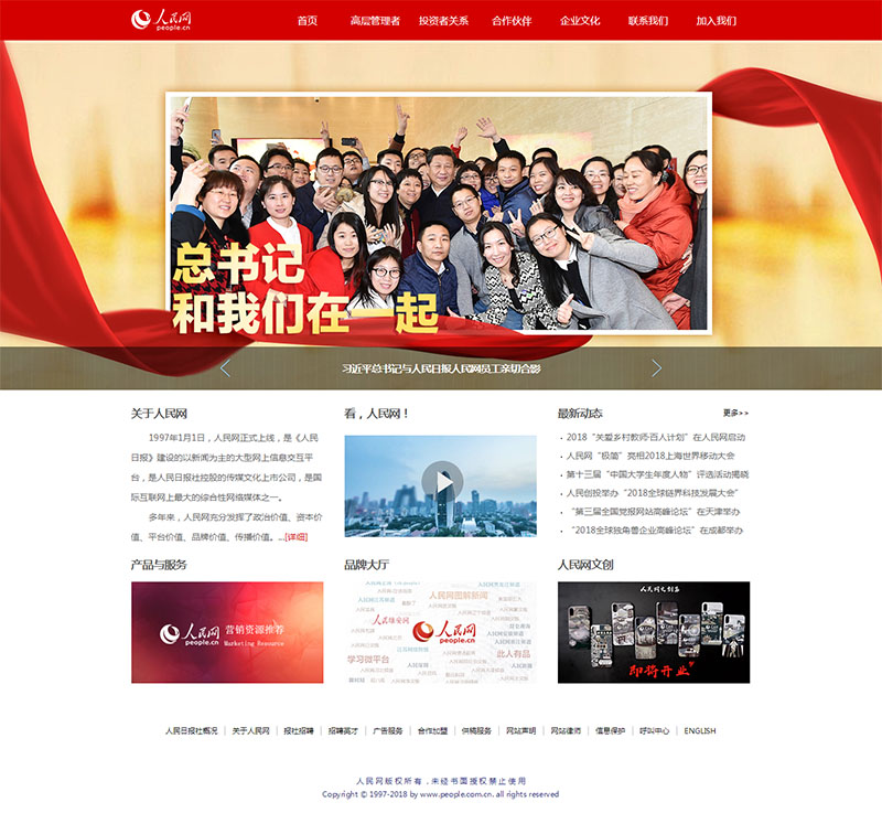 改版后,內容呈現上既有人民網實力的全面展示,也突顯了上市公司的專業化形象。為了便于網友“零距離接觸”人民網,頁面主展示區劃分成“關于人民網”“看,人民網!”“最新動態”“產品與服務”“品牌大廳”“人民網文創”六大塊區域,內容重點突出,直觀醒目。