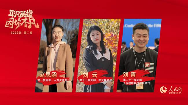經過入圍候選人在線上的精彩展示角逐,根據人民網黨委和管理層成員,黨支部書記、部門負責人代表,以及黨支部委員、黨員和群眾代表等30位評委現場打分,最終,來自第一黨支部、人力資源部的人事專員趙思函,第十三黨支部、社交媒體部短視頻組主編劉云,第二十一黨支部、人民視聽子公司視頻總監劉青三位同志分別榮獲人民網2022年度第二季“平凡英雄”服務獎、創新獎和奮斗獎。同時,杜明明、燕帥、景玥、許維娜、楊伊、陳思、王亞微等七位同志獲得“平凡英雄”入圍獎。