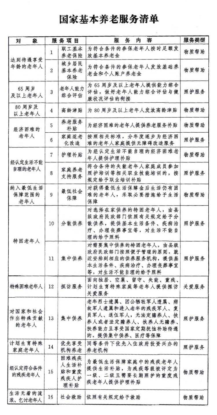 據了解,《國家基本養老服務清單》以保障老年人的基本生活安全為主線,對現行有效的法律法規和政策文件中已經明確的涉及老年人的基本服務項目進行了梳理歸納,整合到基本養老服務的制度框架下。