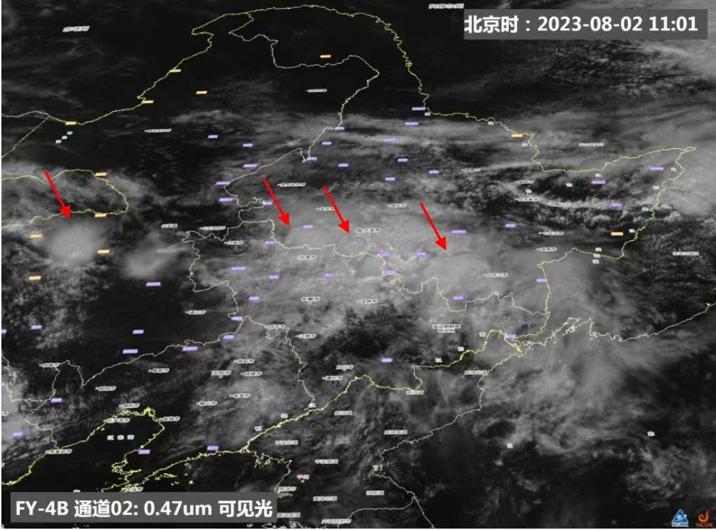 風(fēng)云四號(hào)B星可見光圖像顯示,黑龍江南部、吉林省北部以及內(nèi)蒙古中東部局地的對(duì)流活動(dòng)明顯,出現(xiàn)白亮的上沖云頂。圖片來(lái)源:國(guó)家衛(wèi)星氣象中心